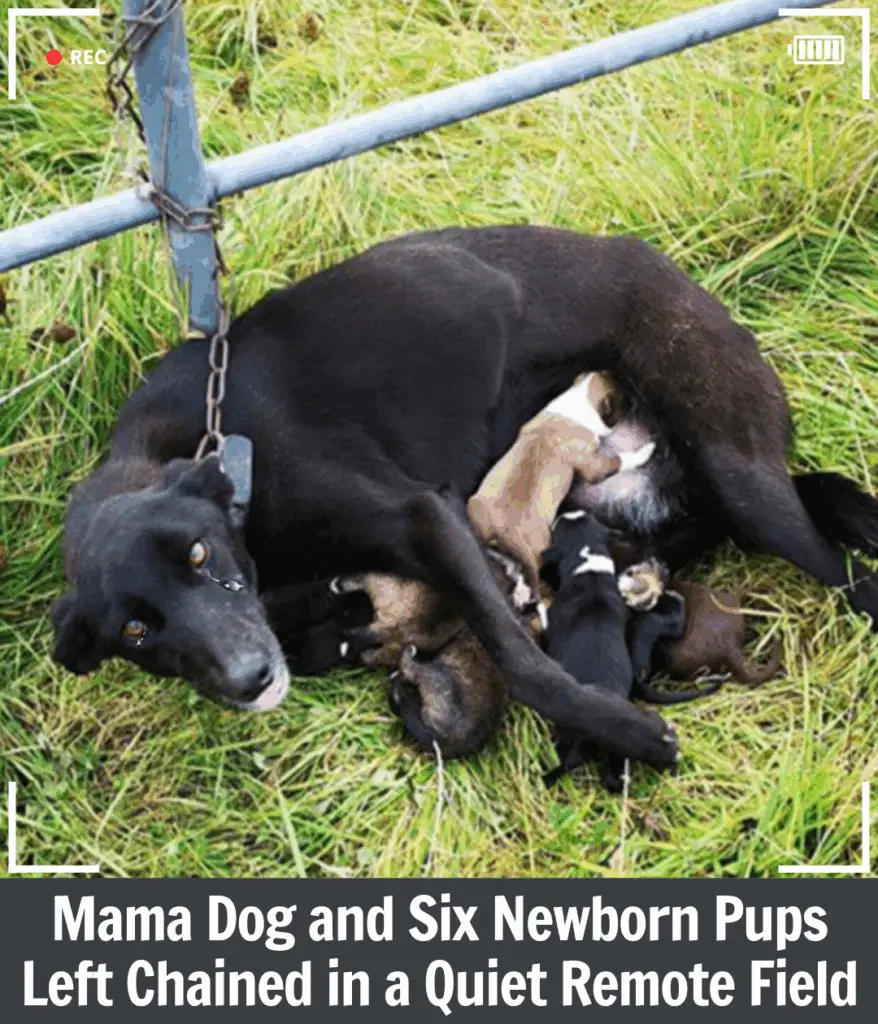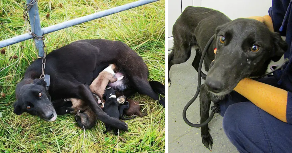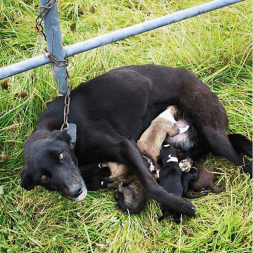 Despite her tight restraint, the lurcher struggled to reach her babies—stretching her body, straining against the chain—just so she could nurse them, warm them, and keep them alive.