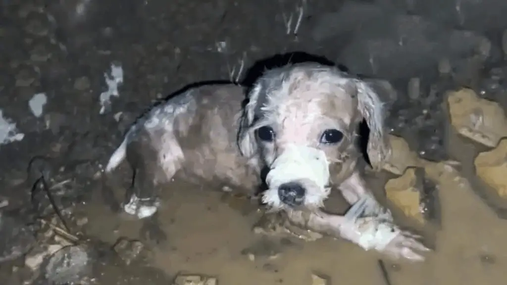 Half-submerged in muddy water, Lucky’s frail body barely moved. His fur was soaked and tangled, clinging to thin skin stretched tightly over fragile bones.
