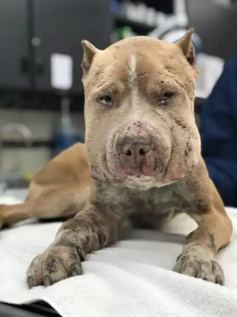 This dog wasn’t just hurt—he was unrecognizable. His face was swollen, his body frail, his spirit nearly crushed.